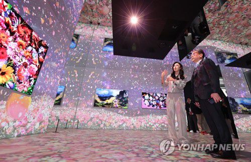 (경주=연합뉴스) 이동해 기자 = 장재훈 현대자동차 그룹 부회장이 28일 경북 경주 엑스포공원 에어돔에서 열린 'K-테크 쇼케이스' 삼성전자 부스를 방문해 아트큐브 공간을 살펴보고 있다. 2025.10.28