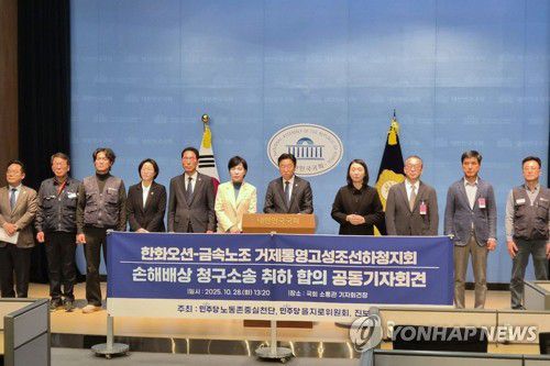 (거제=연합뉴스) 28일 오후 서울 여의도 국회 소통관에서 한화오션과 금속노조 거제통영고성 조선하청지회, 더불어민주당노동존중실천단 등이 '손해배상청구 소송 취하 합의 공동 기자회견'을 하고 있다. 2025.10.28 [금속노조 거제통영고성 조선하청지회 제공. 재판매 및 DB 금지]