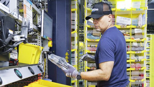 미국 매사추세츠주 찰튼에 위치한 아마존 물류 센터에 아마존 직원이 온라인 주문처리를 위해 상품 보관대에서 물품을 분류하고 있다. EPA=연합뉴스 |