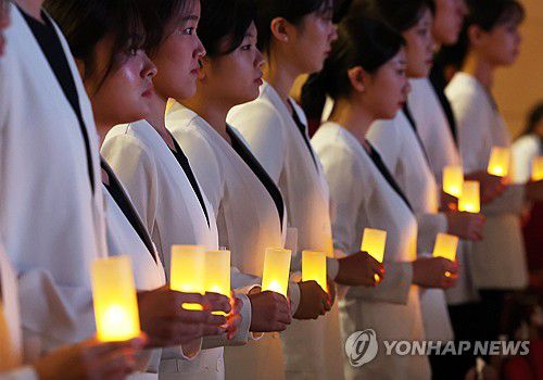 (수원=연합뉴스) 홍기원 기자 = 28일 경기도 수원시 아주대학교에서 열린 '간호대학 제27회 나이팅게일 선서식'에서 학생들이 촛불의식을 하고 있다. 2025.10.28