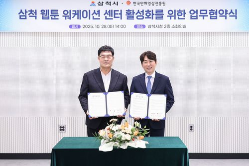 (삼척=연합뉴스) 유형재 기자 = 강원 삼척시와 한국만화영상진흥원은 28일 '삼척 웹툰 워케이션센터' 활성화를 위해 업무협약을 체결했다.