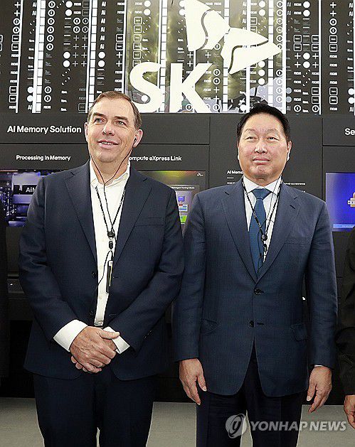 삼성전자 부스 바로 옆에 위치한 SK 부스에는 AI 데이터센터에 필요한 SK하이닉스, SK텔레콤, SKC, SK엔무브 등의 반도체와 냉각, 운영·보안 등 AI 인프라 역량이 소개됐다.