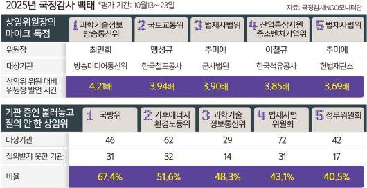 상임위원장의 마이크 점유 시간이 다른 의원 질의 시간보다 3배 이상 많았던 국감 현황에서도 법사위와 과방위가 두드러졌다. 법사위는 피감기관 4곳에 대한 국감장에서 3.01∼3.9배 많았고, 과방위는 2곳에서 3.31∼4.21배 많았다.