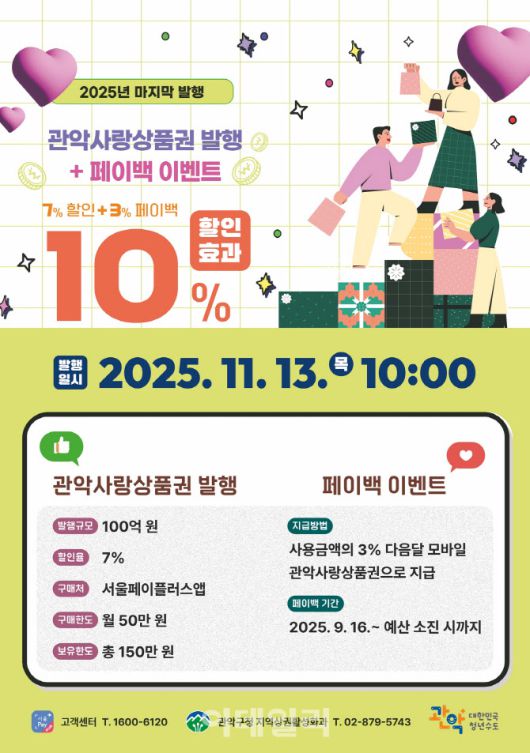 한편 10월 29일부터 11월9일까지 12일간 열리는 ‘2025 코리아그랜드 페스티벌’ 기간에는 관악사랑상품권으로 결제하면 사용 금액의 5%를 페이백 상품권으로 돌려주는 환급 혜택이 적용된다.