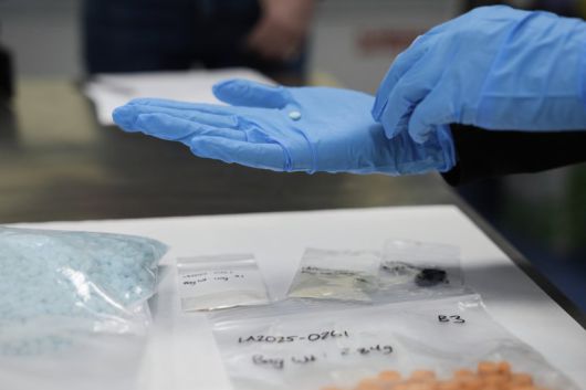 지난 3월 16일 미국 캘리포니아 샌디에이고의 산이시드로 국경검문소를 방문한 크리스티 놈 국토안보부 장관이 펜타닐 정제를 살펴보고 있다. 사진=뉴시스 |