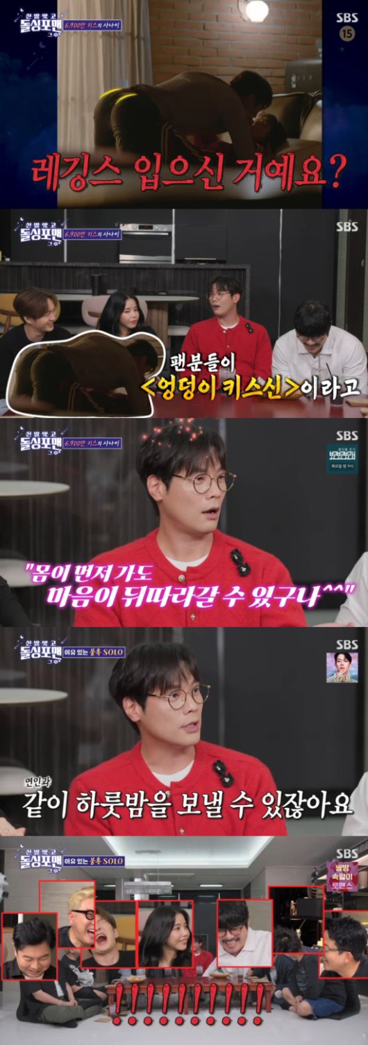 영상을 본 탁재훈은 "레깅스를 신었냐"며 유독 부각된 엉덩이 라인을 꼬집었고, 이에 최다니엘은 "실루엣에 둔부가 보였다. 팬들이 '엉덩이 키스신'이라고 했다. 그걸 보려고 엄청 봤다고 하더라"고 답해 웃음을 자아냈다.