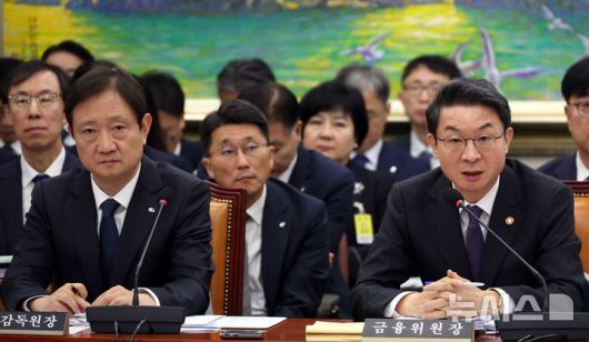 [서울=뉴시스] 조성봉 기자 = 이억원 금융위원회 위원장이 27일 오전 서울 여의도 국회 정무위원회에서 열린 국정감사에서 의원 질의에 답변하고 있다. 왼쪽은 이찬진 금융감독원장. 2025.10.27. suncho21@newsis.com |