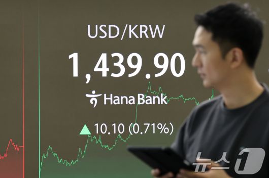 30일 오후 서울 중구 하나은행 본점 딜링룸 전광판에 달러·원 환율이 나오고 있다. 달러·원 환율은 한때 6개월만에 최고치인 1,440원을 돌파했으며 오후 3시 30분 기준 전 거래일 대비 10.10원 오른 1,439.9원에 거래되고 있다. 2025.10.23/뉴스1 ⓒ News1 이호윤 기자 |