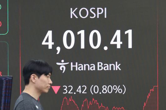 28일 서울 중구 하나은행 본점 딜링룸 현황판에 코스피 지수가 표시돼 있다. 이날 코스피는 전 거래일 대비 32.42p(0.80%) 내린 4010.41로 마감했다. [연합] |
