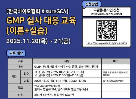 한국바이오협회가 다음 달 20일부터 21일까지 이틀간 제조·품질관리 전문 교육기관 슈어GCA와 바이오·제약 분야 재직자 대상 'GMP 실사 대응 교육'을 실시한다고 29일 밝혔다.