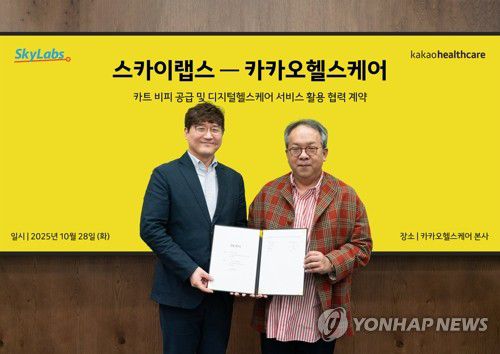 (서울=연합뉴스) 지난 28일 경기 성남시 카카오헬스케어 본사에서 스카이랩스와 카트 비피 공급 및 디지털 헬스케어 서비스 활용 협력 계약을 체결한 후 황희 카카오헬스케어 대표이사(오른쪽)와 이병환 스카이랩스 대표이사가 기념 촬영하고 있다. 2025.10.29 [카카오헬스케어 제공. 재판매 및 DB 금지]