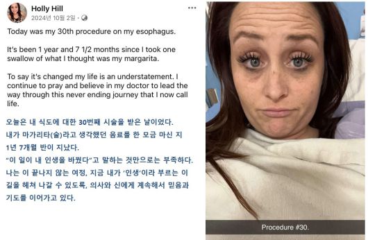 의료진은 힐의 식도에 구멍이 생긴 것을 확인했고, 그는 이후 수십 차례의 시술과 위관 영양 치료를 이어가야 했습니다.