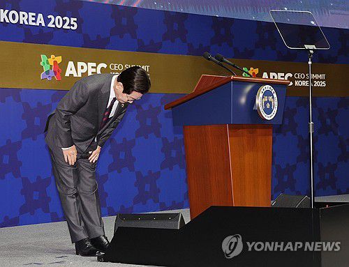 (경주=연합뉴스) 한상균 기자 = 이재명 대통령이 29일 경북 경주예술의전당에서 열린 'APEC CEO(최고경영자) 서밋'에서 특별연설을 마친 뒤 인사하고 있다. 2025.10.29