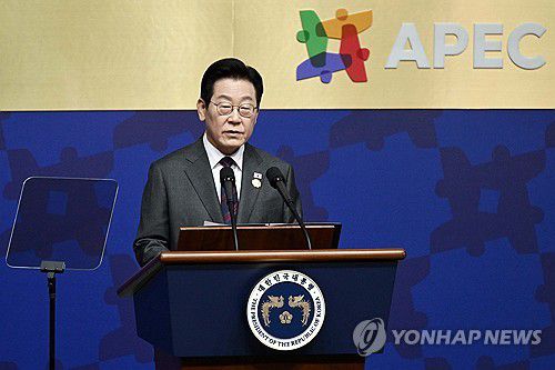 (경주=연합뉴스) 한종찬 기자 = 이재명 대통령이 29일 경북 경주예술의전당에서 열린 'APEC CEO(최고경영자) 서밋' 개회식에서 특별연설을 하고 있다. 2025.10.29 [공동취재]