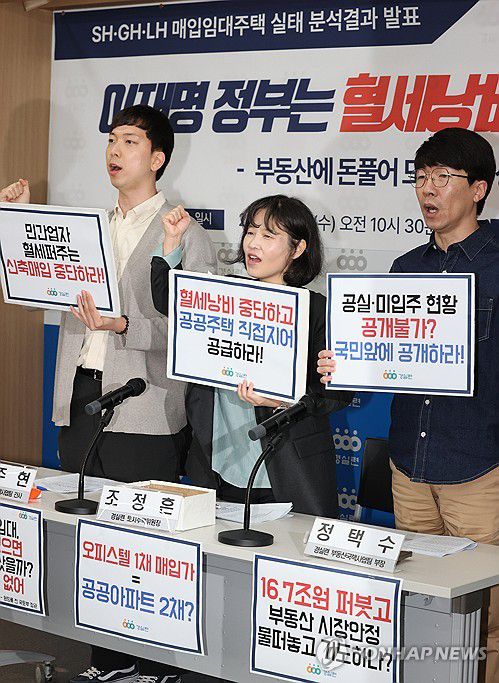 (서울=연합뉴스) 이재희 기자 = 29일 서울 종로구 경실련에서 열린 SH·GH·LH 매입임대주택 실태 분석결과 발표 기자회견에서 참석자들이 손팻말을 들고 구호를 외치고 있다. 2025.10.29
