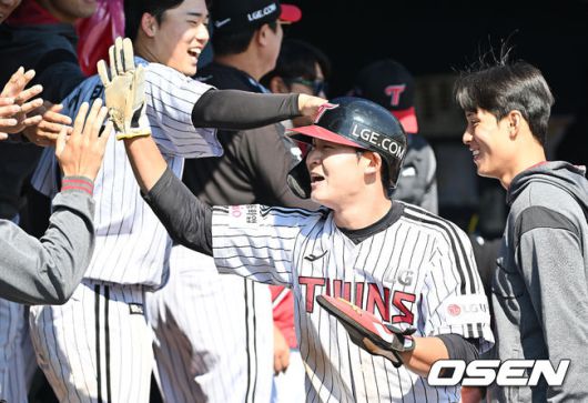 [OSEN=창원, 이석우 기자] 29일 창원 마산야구장에서 2025 울산-KBO Fall League 독립 선발팀과 LG 트윈스의 경기가 열렸다. 독립 선발팀은 진현우가, LG 트윈스는 성준서가 선발 출전했다. LG 트윈스 엄태경이 1회말 2사 2루 문정빈의 1타점 안타때 득점을 올리고 하이파이브를 하고 있다. 2025.10.29 / foto0307@osen.co.kr