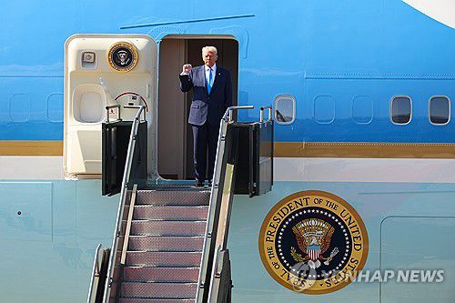 (부산=연합뉴스) 이동해 기자 = 경주 APEC을 계기로 국빈 방한하는 도널드 트럼프 미국 대통령이 29일 부산 김해국제공항에 도착해 전용기 에어포스원에서 인사하고 있다. 2025.10.29