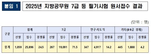 행정안전부는 다음 달 1일 지방직 7급, 연구·지도직 등 필기시험을 17개 시·도에 마련된 66개 시험장에서 동시 진행한다고 29일 밝혔다. 행안부가 17개 시·도의 원서접수 결과를 토대로 집계한 이번 필기시험의 평균 경쟁률은 24.5대 1로, 총 1059명 선발에 2만5896명이 지원했다.