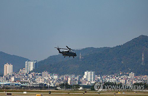 (부산=연합뉴스) 손형주 기자 = 경주 APEC을 계기로 국빈 방한한 도널드 트럼프 미국 대통령이 탑승한 전용헬기 마린원이 29일 부산 김해국제공항에서 경주를 향해 날아가고 있다. 2025.10.29