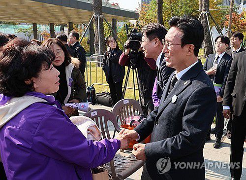 (서울=연합뉴스) 이정훈 기자 = 김민석 국무총리가 29일 서울 종로구 광화문 광장에서 열린 이태원 참사 3주기 기억식에서 유가족을 위로하고 있다. 2025.10.29