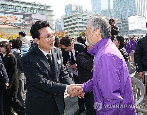 (서울=연합뉴스) 류영석 기자 = 김민석 국무총리가 29일 서울 광화문광장에서 열린 10.29 이태원 참사 3주기 기억식에서 유가족들과 인사를 나누고 있다. 2025.10.29