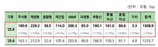 29일 금융투자협회(금투협)가 발표한 '2025년 3분기 펀드시장 동향'에 따르면 지난 9월 말 기준 주식형 펀드 AUM(순자산총액)은 190조9000억원으로 지난 2분기 대비 17%(27조8000억원) 증가했다. 같은 기간 부동산 펀드는 1.7%(3조2000억원) 늘어 190조1000억원이었다.
