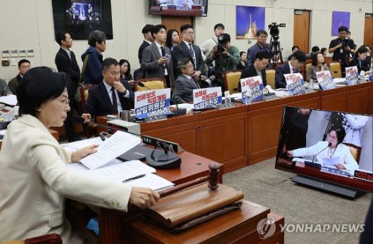 이날 국민의힘 의원들은 과방위 국감 개의와 동시에 최민희 위원장에 의사진행 발언을 요구했다. 위원장은 불허했다. 국민의힘 의원들은 자신의 자리에 '딸 결혼식 거짓 해명', '언론보도 직접 개입', '행정실 직원 갑질' 등의 내용과 상임위원장 사퇴를 요구하는 문구가 담긴 팻말을 붙였다.