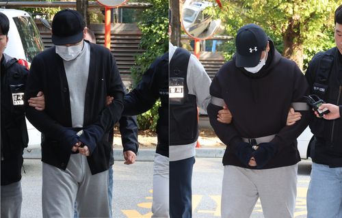 (인천=연합뉴스) 최은지 기자 = 인천 아파트 지하 주차장에서 유명 유튜버를 납치해 살해하려 한 남성 2명이 처음으로 언론에 모습을 드러냈다.