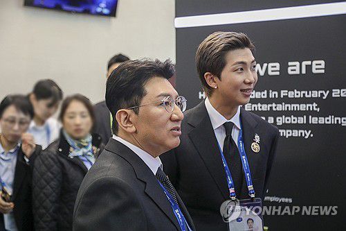 (서울=연합뉴스) 29일 경주 예술의전당에서 열린 'APEC CEO 서밋' 개회식에서 방시혁 하이브 의장과 방탄소년단 RM이 하이브 홍보부스를 관람하고 있다. 2025.10.29 [하이브 제공. 재판매 및 DB 금지]