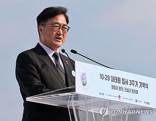 (서울=연합뉴스) 류영석 기자 = 우원식 국회의장이 29일 서울 광화문광장에서 열린 10.29 이태원 참사 3주기 기억식에서 추모사를 하고 있다. 2025.10.29