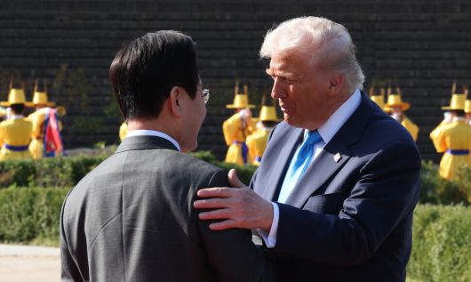 이재명 대통령이 29일 한미 정상회담이 열리는 경북 경주박물관에 도착한 도널드 트럼프 미국 대통령을 맞이하고 있다. 김태형 기자 xogud555@hani.co.kr |