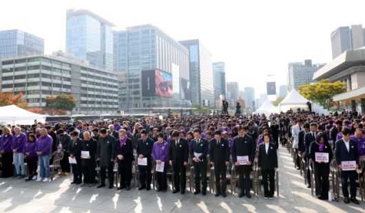29일 오전 10시 29분, 이태원 참사 날짜와 숫자가 같은 시각 서울 전역에 추모 사이렌이 울려 퍼지면서 10.29 이태원 참사 3주기 기억식 '별들과 함께, 진실과 정의로'가 서울 광화문 광장에서 시작됐다. 유족과 내빈 360여 명, 참여 시민 300여 명 등 추모식장을 가득 메운 참석자들은 1분간 울린 사이렌 소리에 묵념했다.