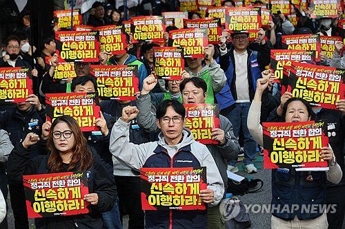 (서울=연합뉴스) 임화영 기자 = 공공운수노조 건강보험고객센터지부 조합원들이 29일 서울고용노동청 앞에서 총파업 결의대회를 열고 정규직 전환 합의를 촉구하고 있다. 2025.10.29