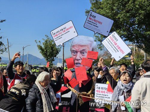 "NO 트럼프·트럼프 GO HOME"(경주=연합뉴스) 김선형 기자 = 29일 오전 경북 경주시 동천동 구황교 인근에서 2025 APEC 반대 국제민중행동 조직위원회가 반(反) 트럼프 시위를 벌이고 있다. 2025.10.29 sunhyung@yna.co.kr ▶제보는 카카오톡 okjebo▶연합뉴스 앱 지금 바로 다운받기~▶네이버 연합뉴스 채널 구독하기<저작권자(c) 연합뉴스, 무단 전재-재배포, AI 학습 및 활용 금지>
