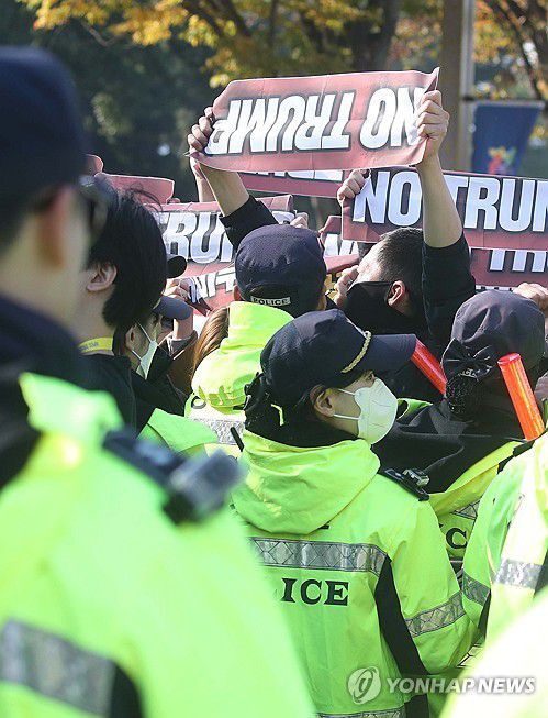 (경주=연합뉴스) 김현태 기자 = 29일 오후 한미 정상회담이 열린 국립경주박물관 인근에서 도널드 트럼프 미국 대통령을 반대하는 기습 시위대가 경찰저지선을 뚫고 정상회담장으로 질주하고 있다. 2025.10.29
