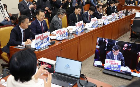 국회 과학기술정보방송통신위원회 국민의힘 의원들이 29일 서울 여의도 국회에서 열린 국정감사에서 노트북에 최민희 위원장을 규탄하는 피켓을 부착한 뒤 감사를 진행하고 있다. /사진=뉴시스 |