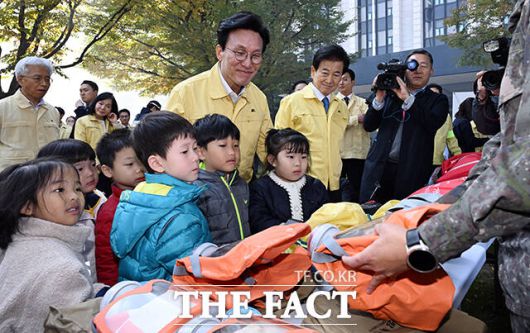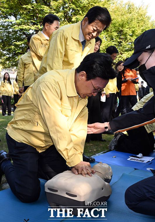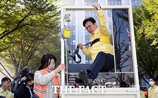 김민석 국무총리는 이날 건물 외벽 화재 진압 훈련을 참관한 뒤 소화기 훈련 및 심폐소생술 등 생활형 안전교육을 차례로 체험했다.