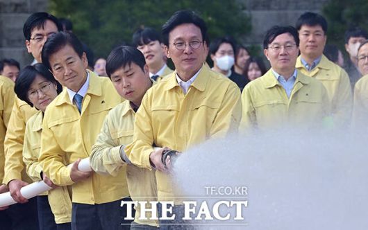 [더팩트ㅣ임영무 기자] 김민석 국무총리가 29일 오후 서울 종로구 정부서울청사에서 열린 화재대비 민방위 훈련에 참가해 화재 진압 훈련을 하고 있다.