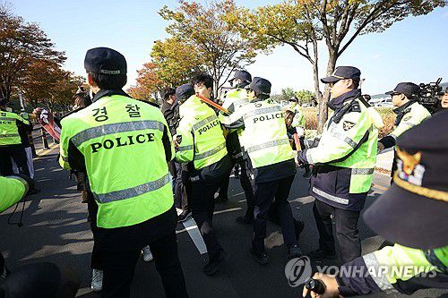 (경주=연합뉴스) 김현태 기자 = 29일 오후 한미 정상회담이 열린 국립경주박물관 인근에서 도널드 트럼프 미국 대통령을 반대하는 기습 시위대가 경찰저지선을 뚫고 정상회담장으로 질주하고 있다. 2025.10.29