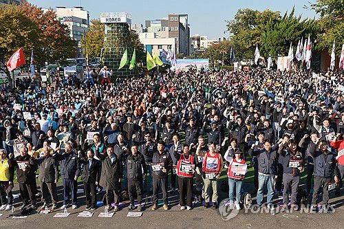 (경주=연합뉴스) 한종찬 기자 = 29일 경주역 폐역에서 민주노총 주최로 열린 경제 수탈 일자리 파괴 트럼프 방한 반대 결의대회에서 참가자들이 민중 의례를 하고 있다. 2025.10.29