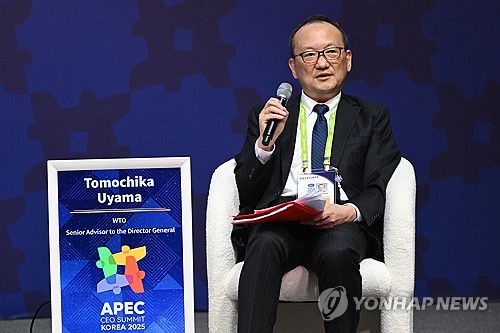 (경주=연합뉴스) 한종찬 기자 = 우야마 도모치카 세계무역기구(WTO) 고문자문위원이 29일 경북 경주 예술의전당에서 열린 아시아태평양경제협력체(APEC) 정상회의 최고경영자(CEO) 서밋(Summit)에 참석해 '지정학적 시대 아태지역 경제협력 방안'을 주제로 토론하고 있다. 2025.10.29 [공동취재]