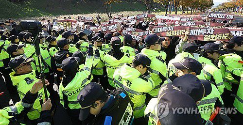 트럼프 반대 시위대 경주박물관 인근서 기습시위(경주=연합뉴스) 김현태 기자 = 29일 오후 한미 정상회담이 열린 국립경주박물관 인근에서 도널드 트럼프 미국 대통령을 반대하는 기습 시위대가 경찰과 대치하고 있다. 2025.10.29 mtkht@yna.co.kr ▶제보는 카카오톡 okjebo▶연합뉴스 앱 지금 바로 다운받기~▶네이버 연합뉴스 채널 구독하기<저작권자(c) 연합뉴스, 무단 전재-재배포, AI 학습 및 활용 금지>