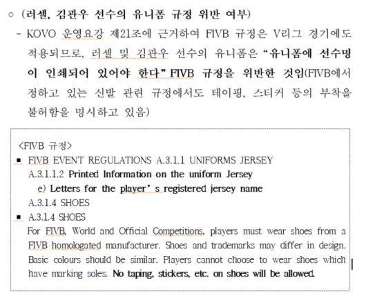 아울러 "한국전력에서 제기한 'FIVB 규정 A.3.1.1.2 Printed Information on the uniform Jersey'에 대해 당 연맹의 해석은 '유니폼 내에 번호, 로고, 국가명, 이름 등이 아래의 기준에 맞게 표기되어 있어야 된다'고 해석했고 대한배구협회에 확인한 결과 해당 규정은 당 연맹의 해석과 동일하다는 의견이었다"고 설명했다.