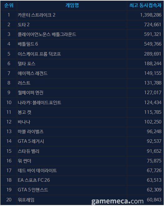일 최고 동시접속자 TOP 20에서는 새 시즌으로 유저를 모은 배틀필드 6가 54만 9,766명을 기록했다. RV 데어 옛?과 메가봉크가 20위 아래로 내려갔고 6만 명대를 꾸준히 유지하던 GTA 5 인핸스드와 워프레임이 빈자리를 채웠다.
