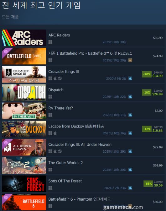 그 외 순위권에서는 아크 레이더스가 출시를 하루 앞두고 1위를 차지했다. 이어 배틀필드 6가 첫 시즌 시작과 함께 배틀로얄 모드인 ‘레드섹’을 추가하는 등 여러 업데이트를 하며 관련 DLC가 최상위권에 올랐다.