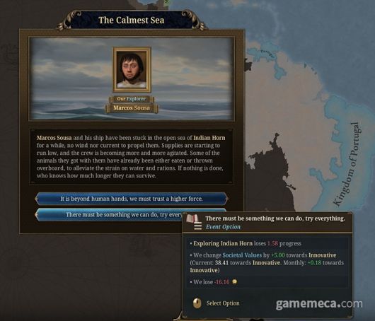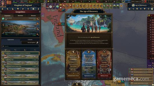 국가 범위를 넓히고 식민지를 건설하거나 새로운 국가를 만나는 것 역시 중요한 요소다. 탐험은 '지정학' 탭에서 관리하며, 국가의 '개척 범위' 내에서 가능하다. 탐험 임무에는 두캇, 선원 또는 인력, 그리고 목재나 해군 보급품 같은 자원이 필요하며, 콜럼버스나 마젤란 같은 역사적 인물을 포함한 '캐릭터'를 탐험가로 할당해야 한다. 탐험은 순풍으로 속도가 빨라지거나 폭풍, 질병 등으로 지연될 수 있으며, 탐험가가 사망하거나 항해 자체가 완전히 실패할 위험도 감수해야 한다. 새로운 지형은 탐험대가 임무를 마치고 본국으로 복귀한 후에야 밝혀진다.