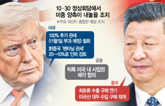 트럼프 대통령은 29일 아시아태평양경제협력체(APEC) 정상회의에 참석하기 위해 일본에서 한국으로 이동하는 전용기에서 취재진과 만나 “(30일 부산 미중 정상회담에서) 펜타닐 문제가 핵심 논의 사항 중 하나가 될 것”이라며 “(미국산 대두 수출 문제와 관련해) 농민 문제도 논의할 것이고 많은 사항을 다룰 것”이라고 예고했다. 또 중국이 12월 1일부로 예고한 희토류 수출통제 강화 조치를 1년 유예하기로 한 방안에 대해서도 합의를 낙관하면서 “중국은 나와 일할 것이고 우리는 뭔가를 할 것”이라고 자신했다.
