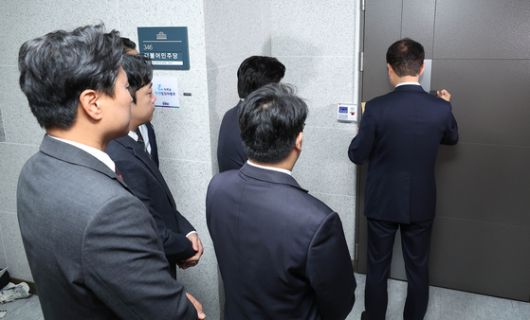 문호철 국민의힘 미디어특위 수석 부위원장(오른족)이 29일 오전 국회 의원회관 더불어민주당 을지로위원회에 '최민희 국회 과학기술정보방송통신 위원장 갑질 의혹' 관련 신고를 하기위해 문을 두드리고 있다. 임현동 기자 |