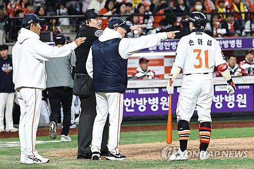 (대전=연합뉴스) 김인철 기자 = 29일 대전한화생명볼파크에서 열린 2025 프로야구 KBO리그 포스트시즌 한국시리즈 3차전 LG 트윈스와 한화 이글스의 경기. 2회말 한화 공격이 끝난 뒤 김경문 감독이 인필드플라이를 선언하지 않은 것에 대한 항의를 하고 있다. 2025.10.29