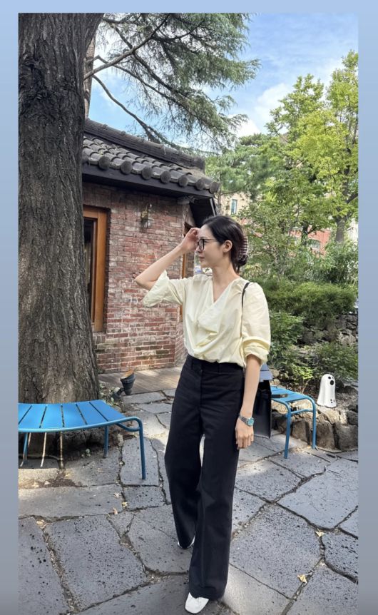 성유리는 29일 자신의 개인 계정을 통해 사진 한 장을 공개했다. 사진 속 성유리는 밝은 색 셔츠에 블랙 팬츠를 착용, 뿔테 안경을 착용한 모습.